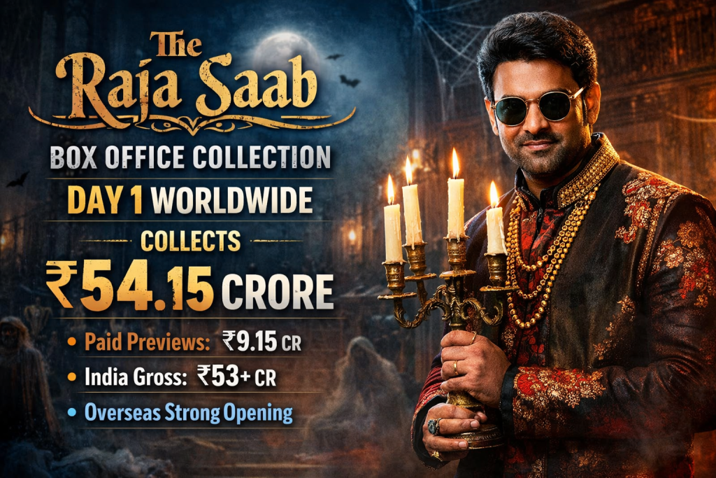 Prabhas’ much-awaited horror-comedy The Raja Saab has finally hit theatres, and the film has taken a strong opening at the worldwide box office on Day 1. Directed by Maruthi, the movie created massive buzz ahead of its release, and the opening-day numbers reflect the excitement among fans and audiences According to early trade estimates, The Raja Saab collected approximately ₹54.15 crore worldwide on its opening day. This figure includes advance bookings, paid previews, and first-day theatrical collections across domestic and overseas markets