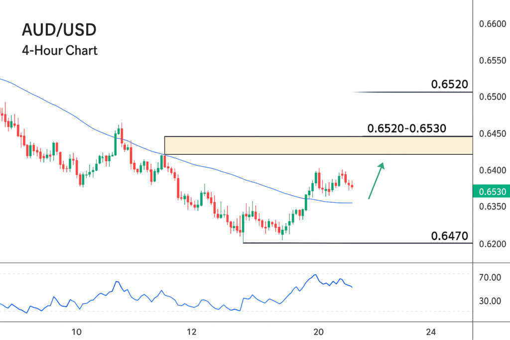 The rebound took AUD/USD back toward 0.6520–0.6530, aligning with short-term resistance and the 50-hour moving average. This area is critical, as a breakout above it could shift momentum in favor of the bulls