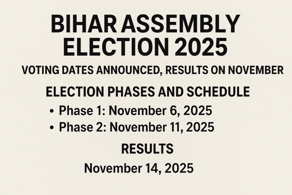 The Election Commission of India has officially announced the schedule for the Bihar Assembly Elections 2025, marking the beginning of a highly anticipated political battle in the state. The elections will be conducted in two phases — on November 6 and November 11, 2025 — with the counting of votes scheduled for November 14, 2025.