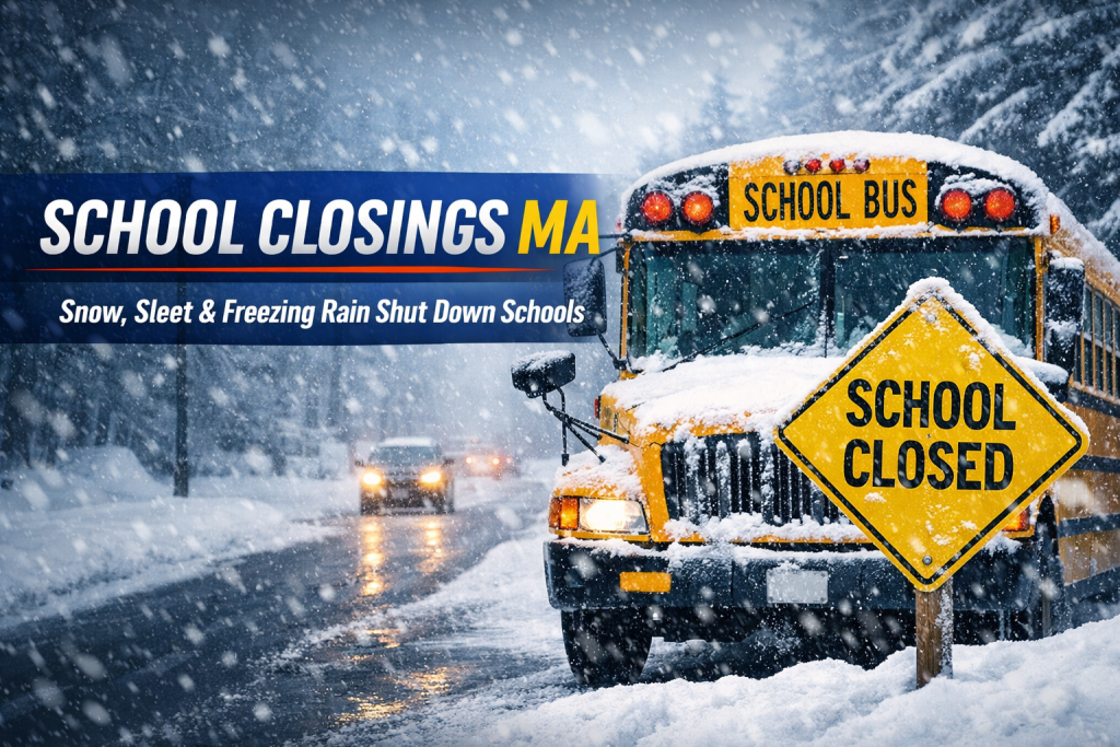 Several schools across Massachusetts announced closures and delays today as a powerful winter storm brought snow, sleet, and freezing rain across parts of the state. Dangerous road conditions early Friday morning forced many districts to cancel classes or implement delayed openings to ensure the safety of students and staff. Local officials said icy roads and reduced visibility created hazardous travel conditions for school buses and commuters.
